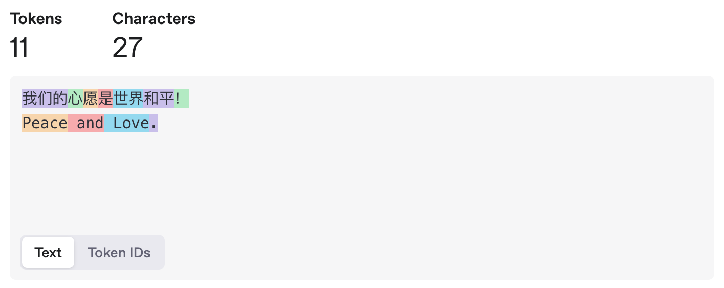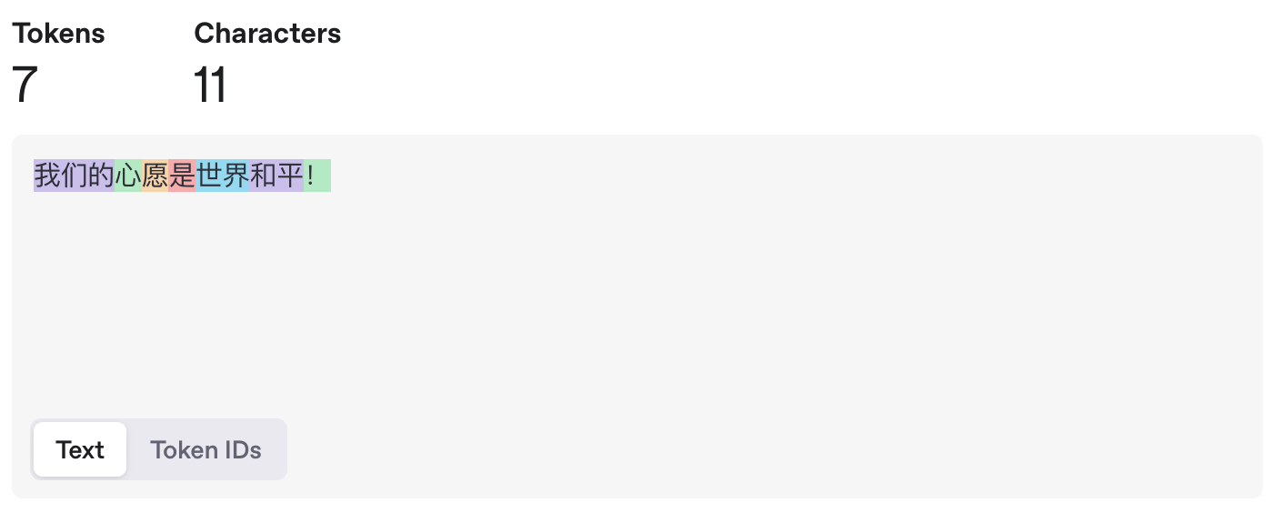 像「心」「愿」「是」这样单个的汉字可能是一个Token;两个汉字构成的词语「世界」「和平」也可能是一个Token;三个字构成的常见短语「我们的」也可能是一个Token;一个单词「Peace」「and」「Love」也可能是一个Token;一个标点符号「!」「.」也可能是一个Token ……