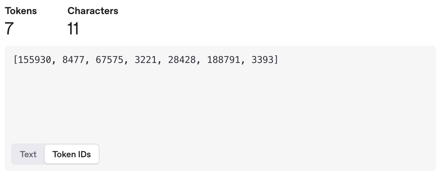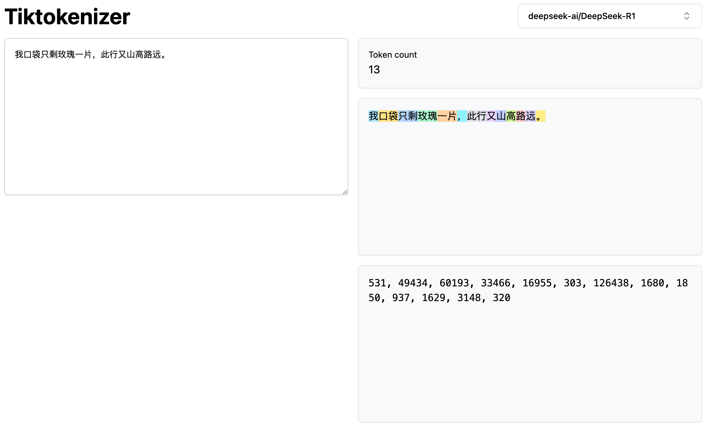 我们可以使用Token计算器(https://tiktokenizer.vercel.app),输入一段话,选择模型,它就可以告诉你这段话是由几个Token构成,分别是什么,以及这几个Token的编号分别是什么: