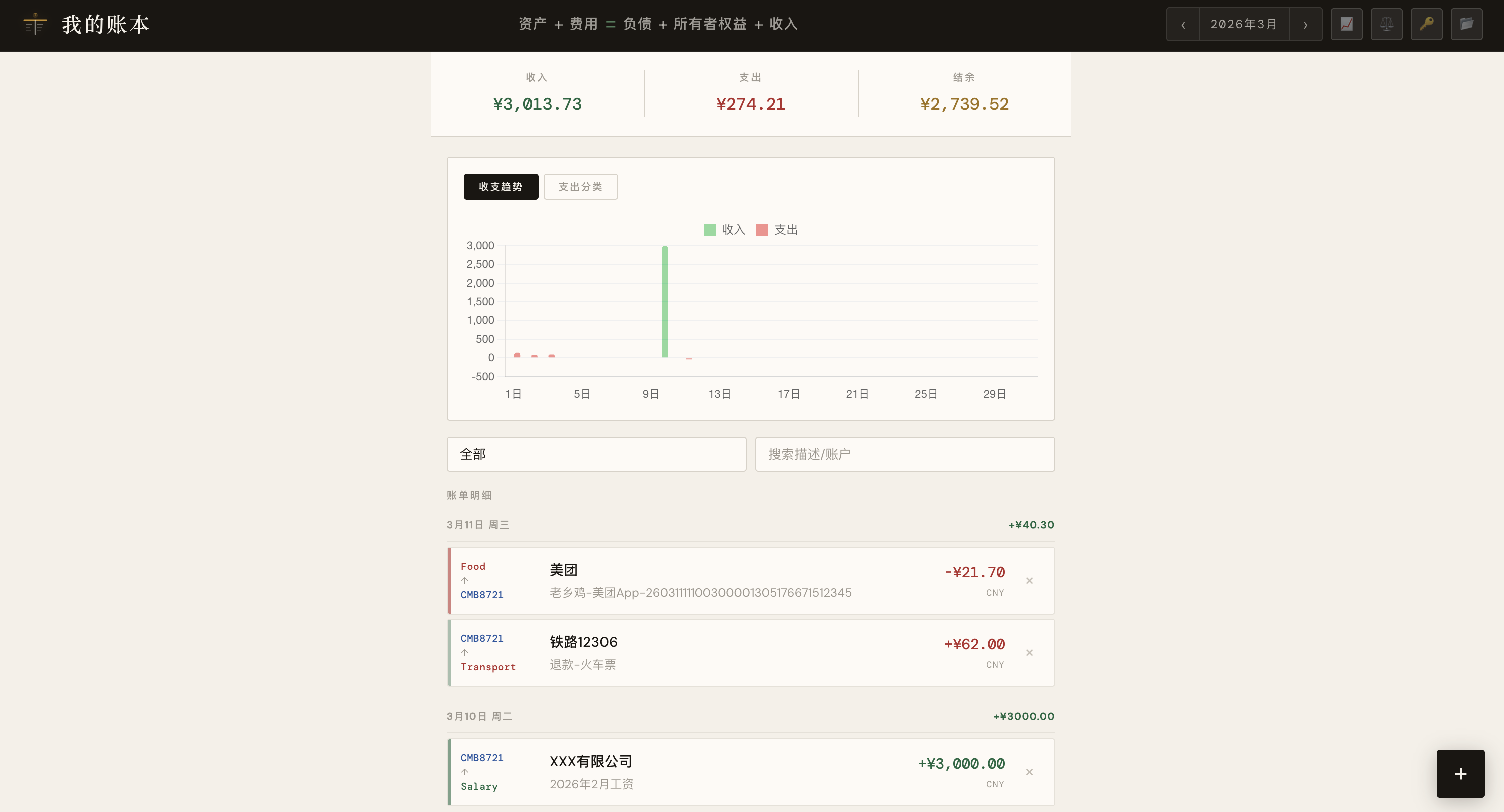 这是 Beancount 复式记账的核心约束,通过持续展示这个公式,也在提醒账务结构始终保持逻辑闭环。