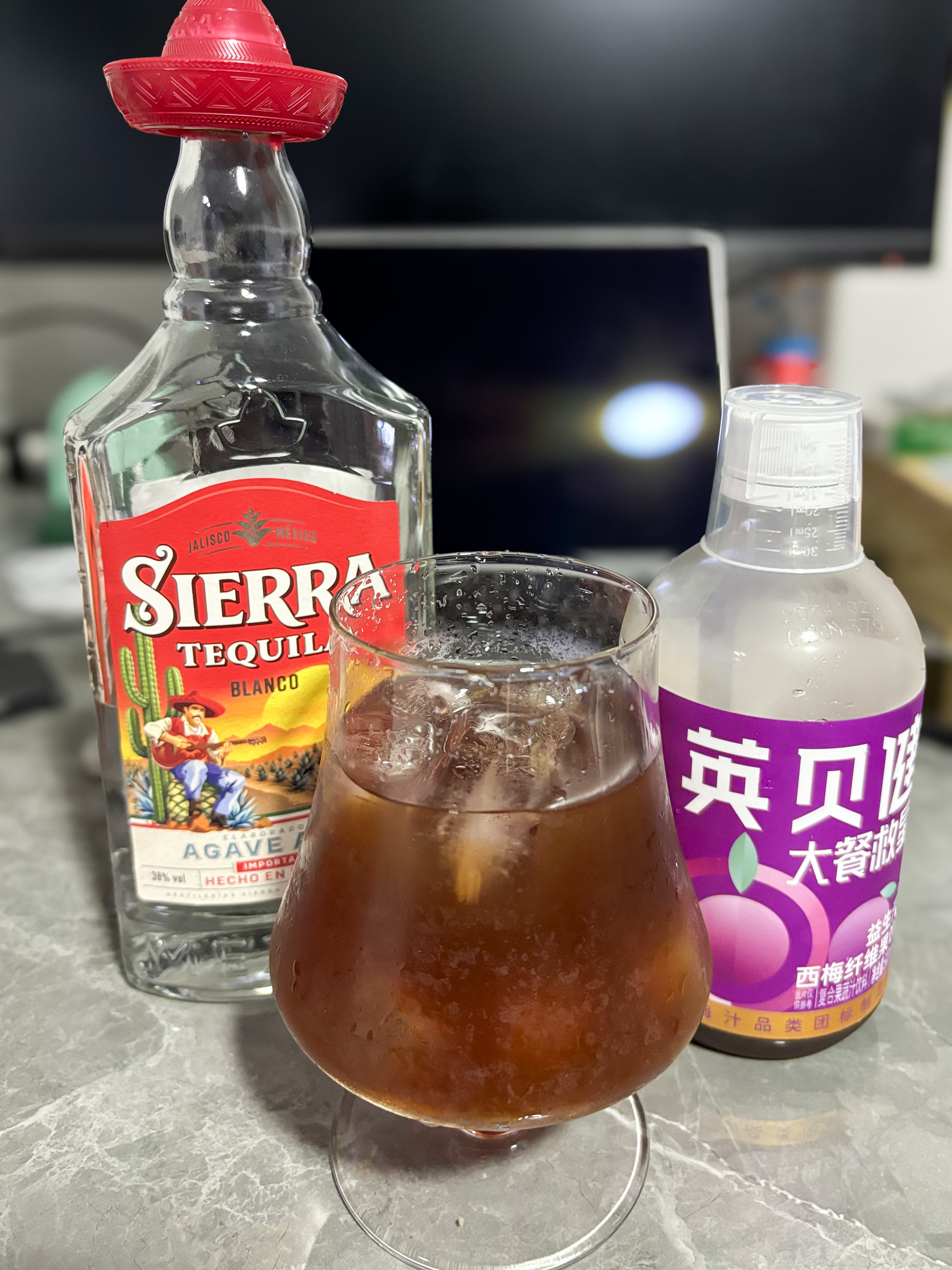 回答的效果看起来还是不错的,包含了图片的基本元素,一瓶龙舌兰、装满冰块的杯子以及一瓶果汁,而且还对这些元素做了详细分析,包括颜色(red label、white letters、purple label)、文字(Sierra Tequila、Chinese charaters)等。