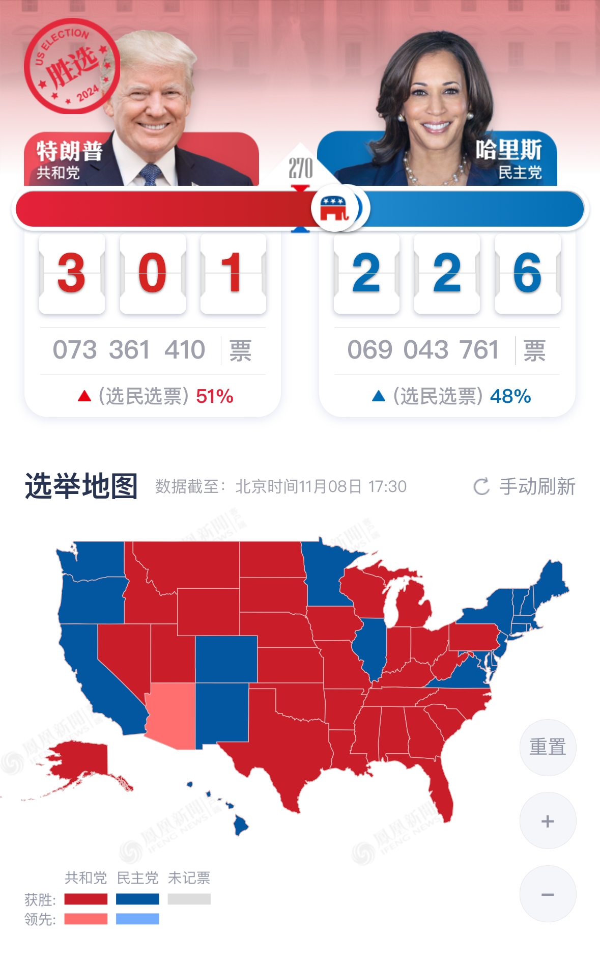 图片来源(The image presents a screenshot of an online news article or website, likely from China, providing real-time 可能来自中国的在线新闻文章或网站的截图)、候选人(Donald Trump (left) and Kamala Harris (right) 特朗普和哈里斯)、当前的得票情况(The current vote count is displayed in large numbers: 301 to 226、A small red triangle indicates that the Republican candidate has received 51% of the votes 票数和比例)、各州选举结果地图(A map of the United States shows the electoral results by state, with each state colored either red (Republican) or blue (Democratic))等。层次分明的结构