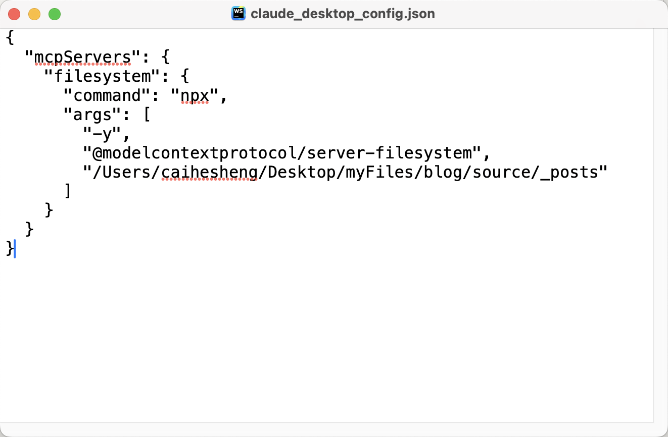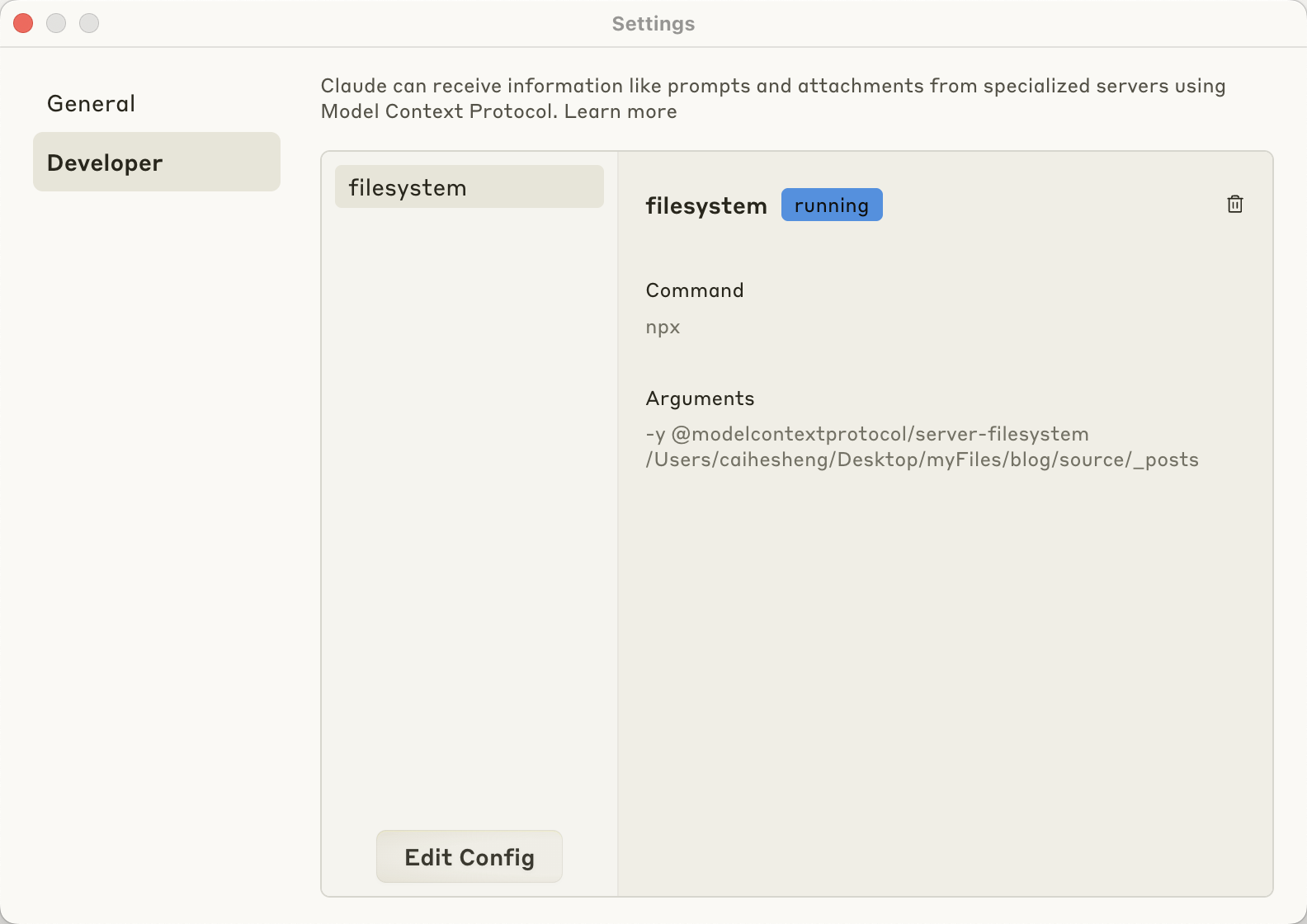 重启 Claude Desktop 以应用更改,可以看到运行中的 filesystem 服务: