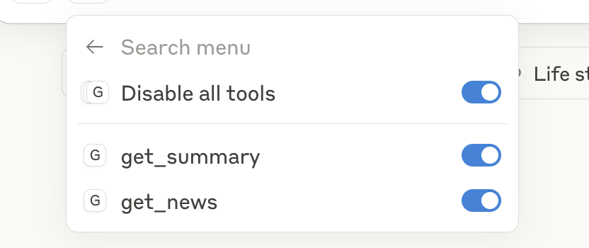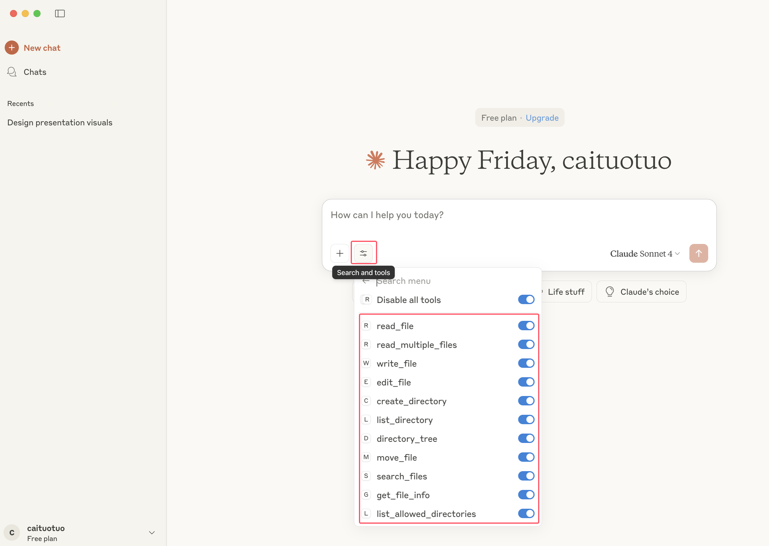 点击 Claude Desktop 对话界面中的 Search and tools 图标夹可以查看 MCP 服务器提供的工具: