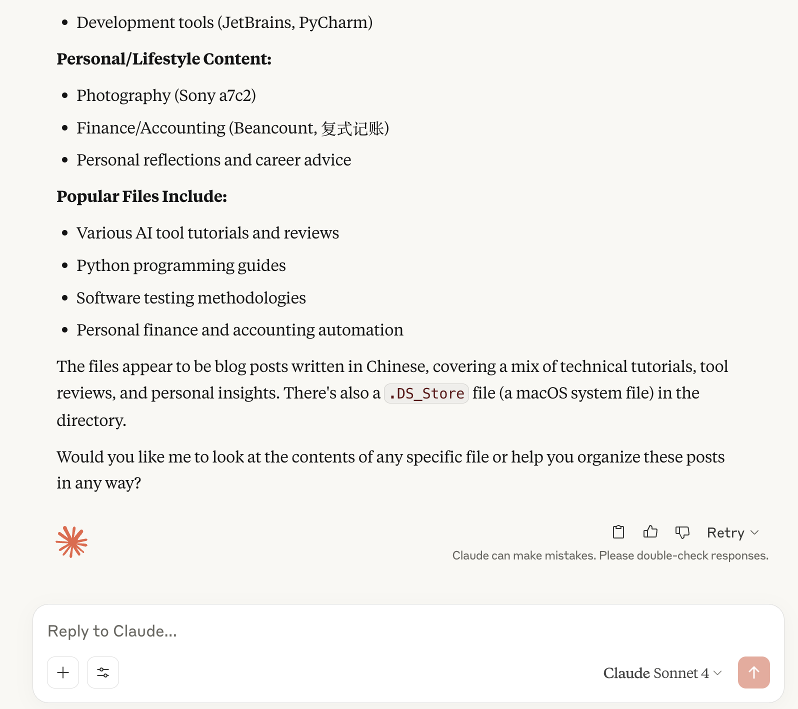 点击授权,Claude 会访问到我指定的目录,它能够成功地发现目录下的所有文件: