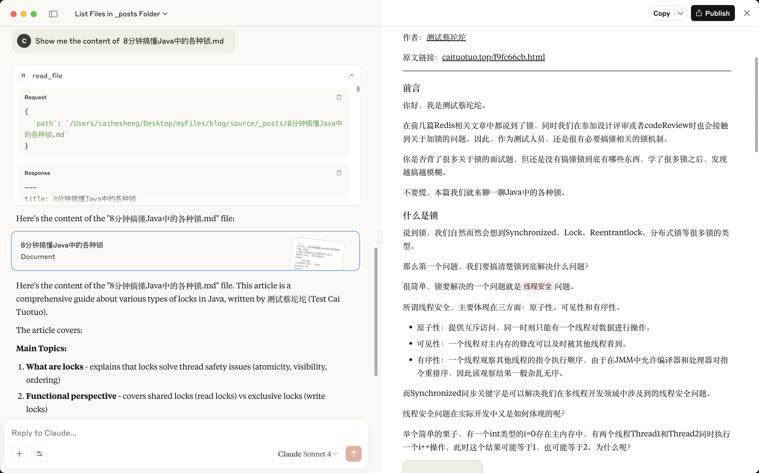 可以看到它成功地调用 read_file 这个工具读取到文章内容,并对内容进行总结: