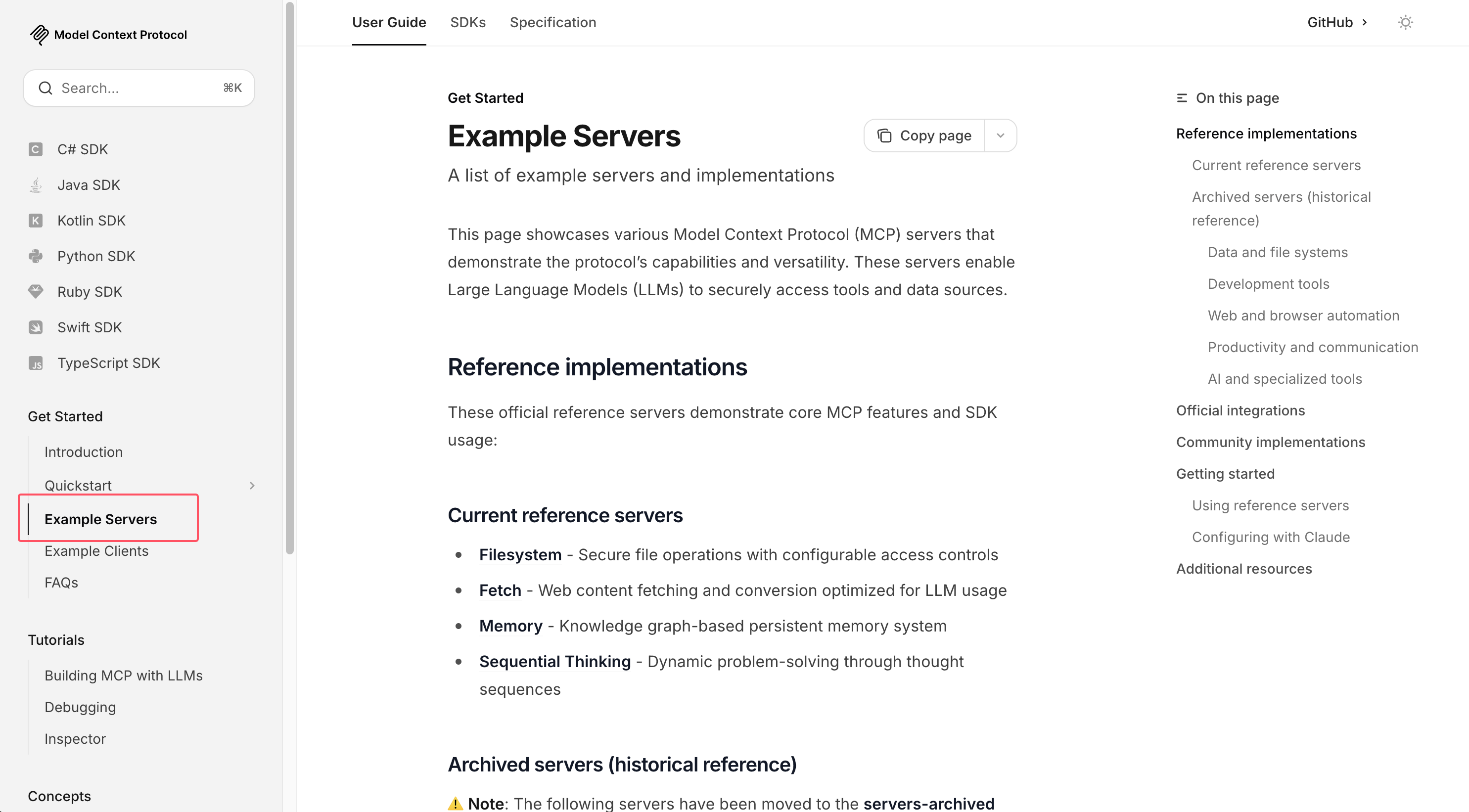 除此之外,MCP 官网还列出了许多可以用的服务,可以根据需要集成到自己的 MCP 客户端: