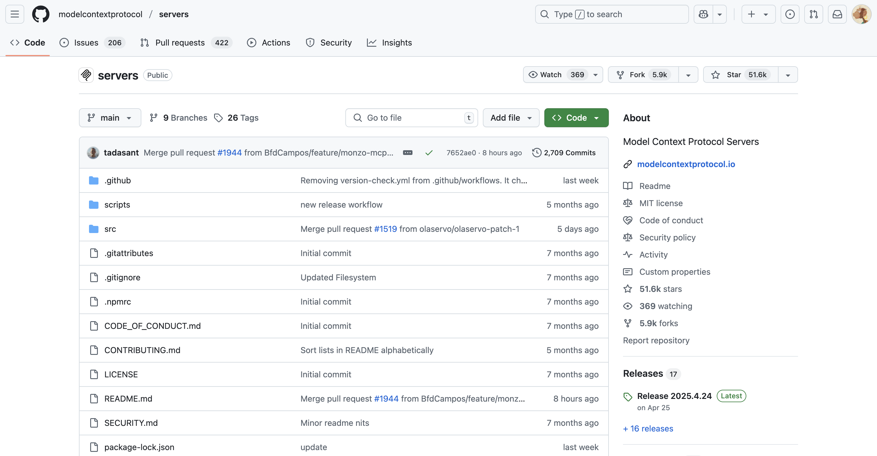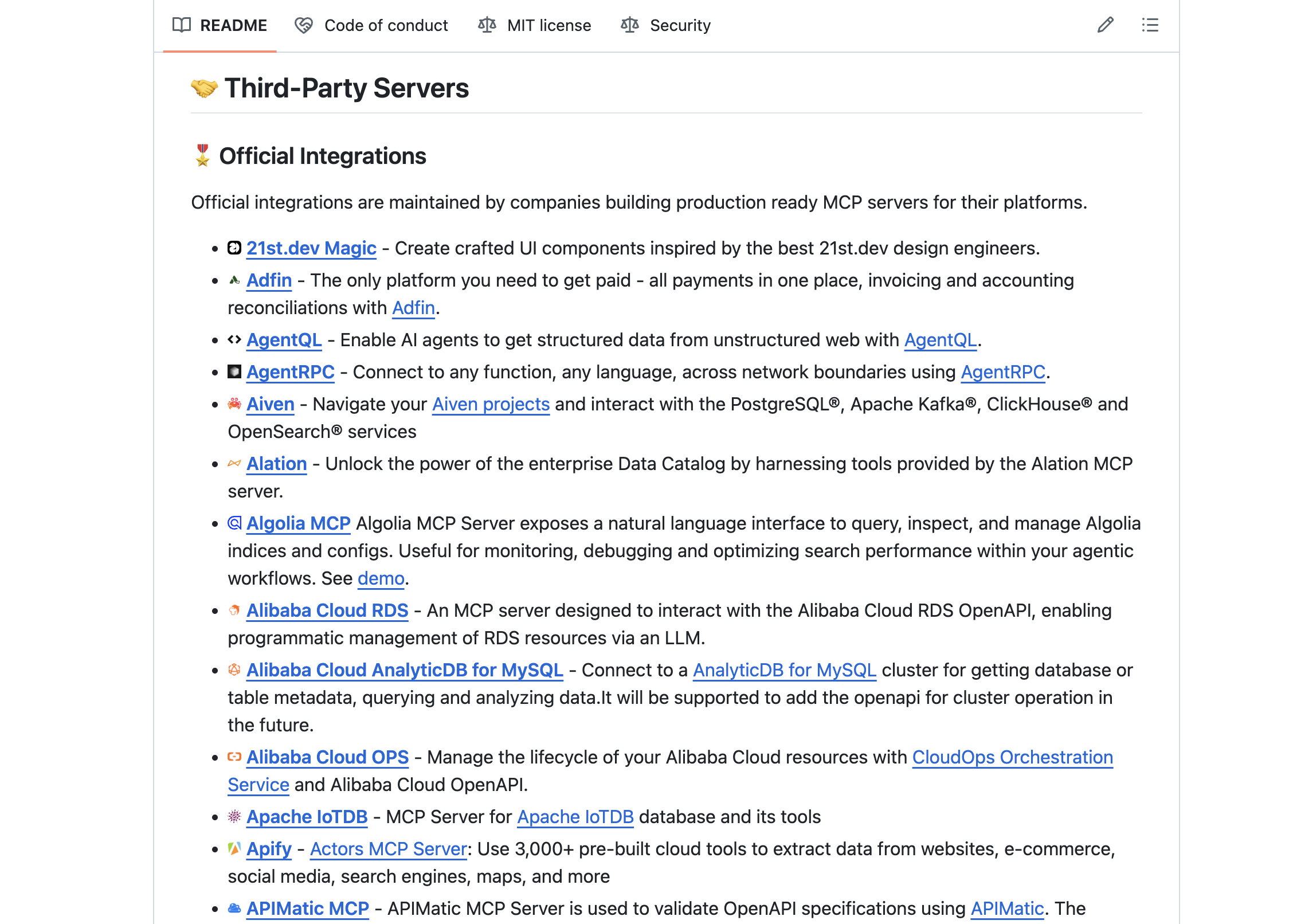 同时,在 MCP 官方的 servers 仓库中也列出了目前市面上绝大多数的官网和三方支持的 mcp 服务: