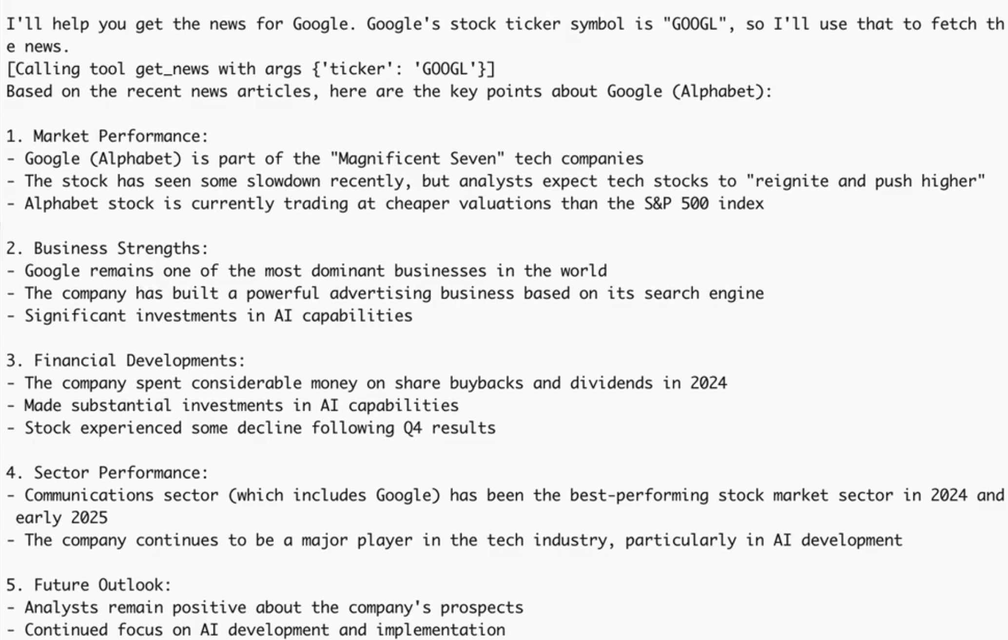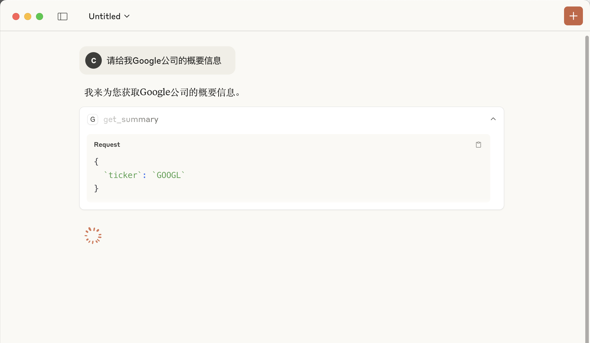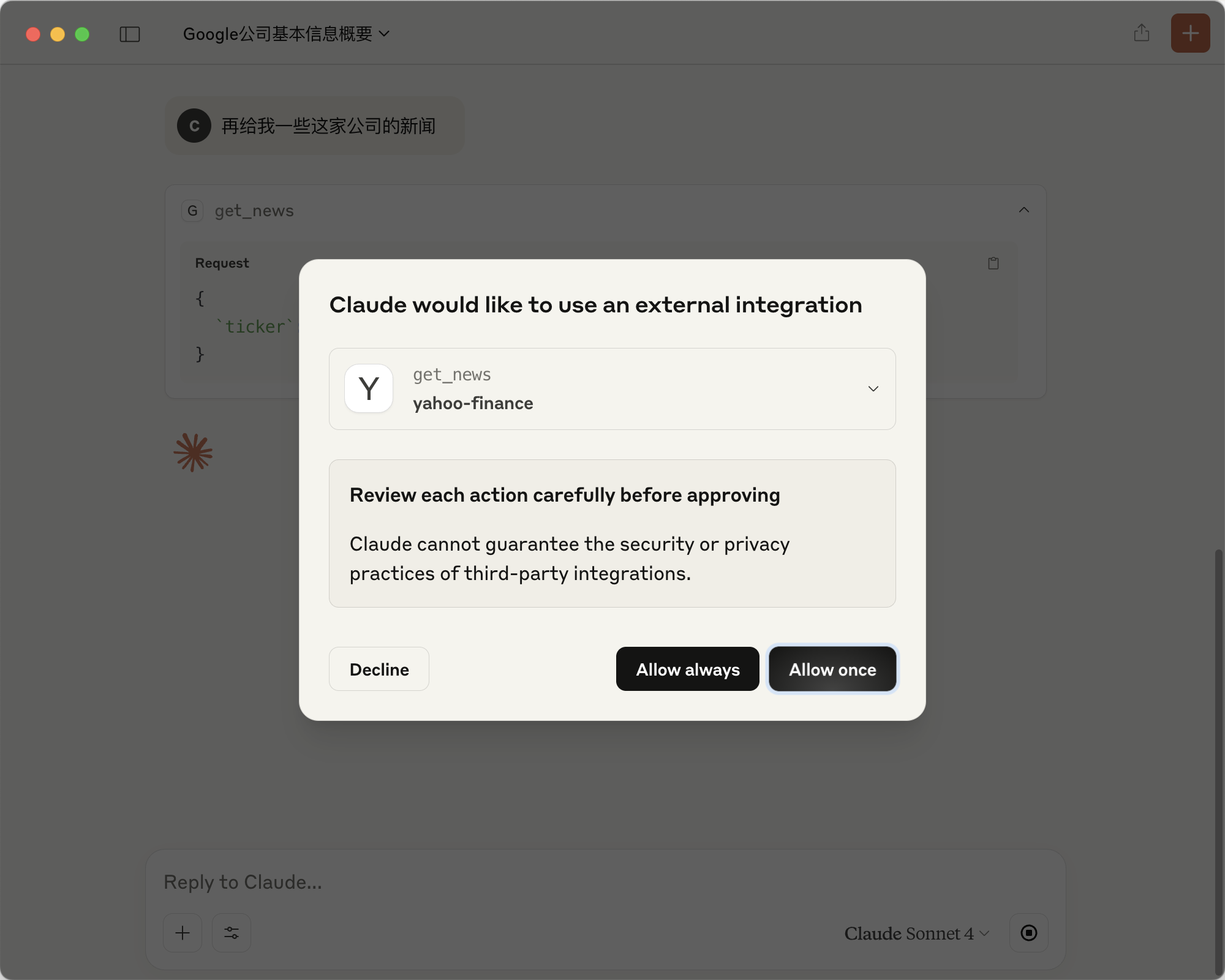 通过这个服务器,Claude 桌面应用将能够回答与公司财务信息和新闻相关的查询。