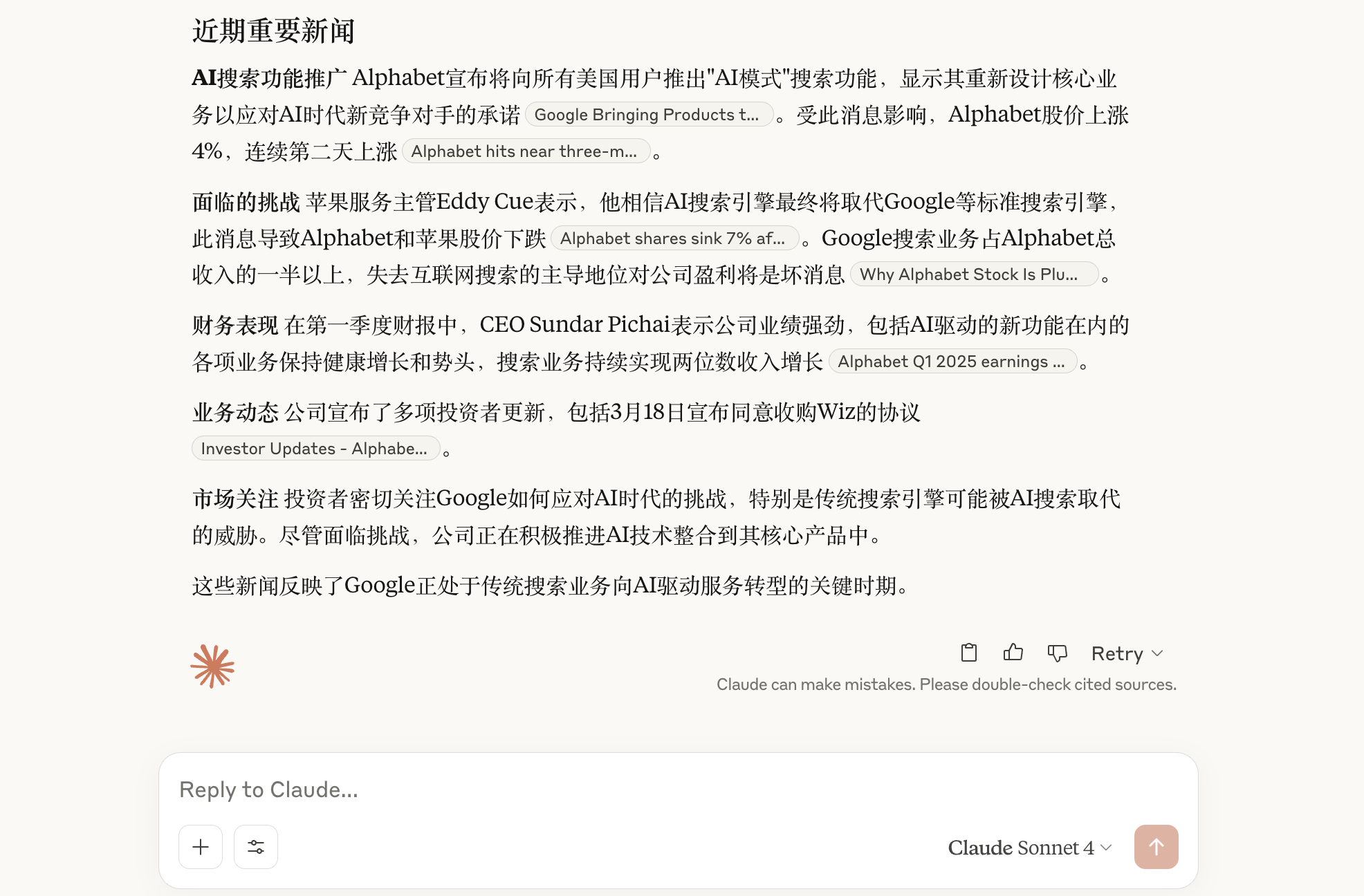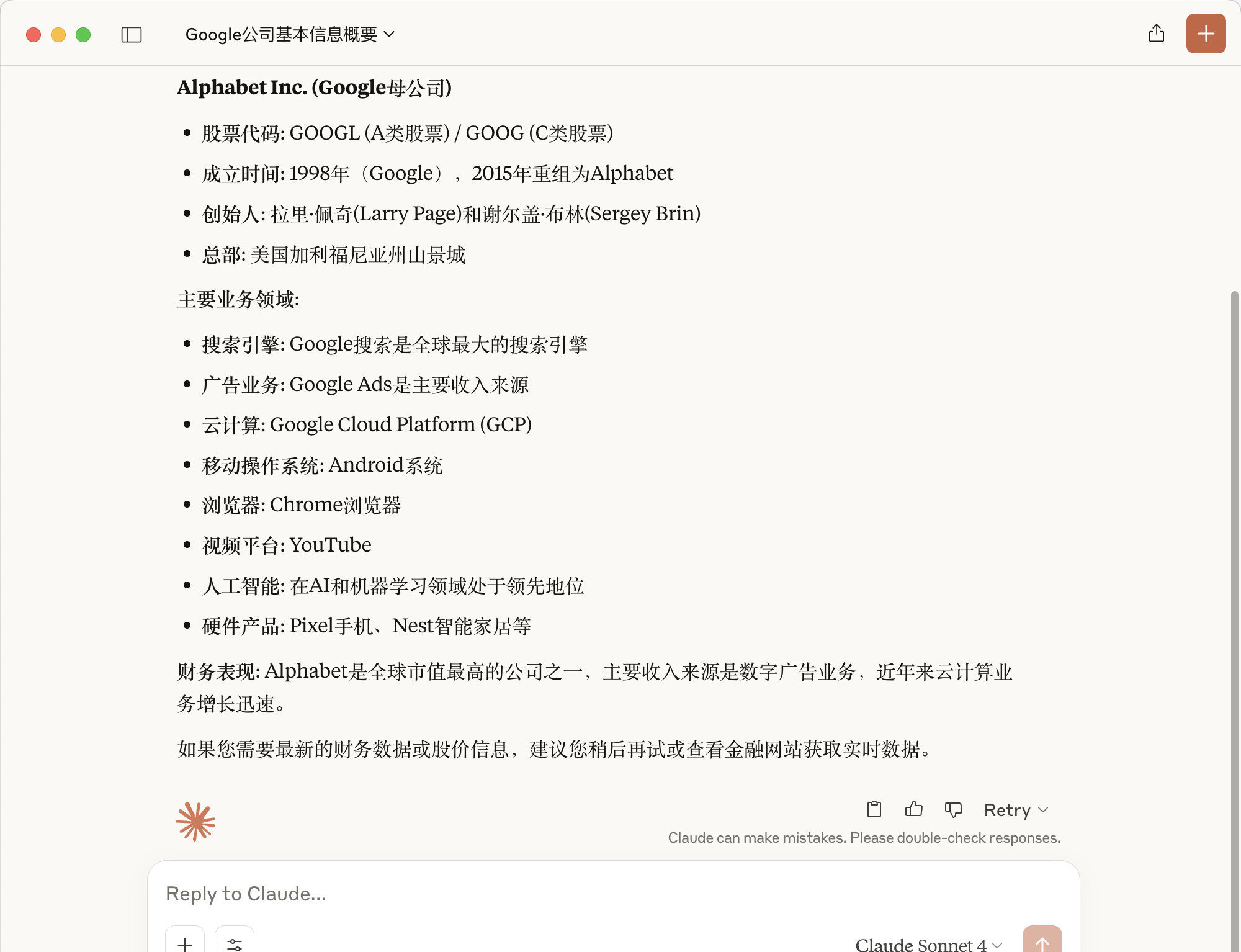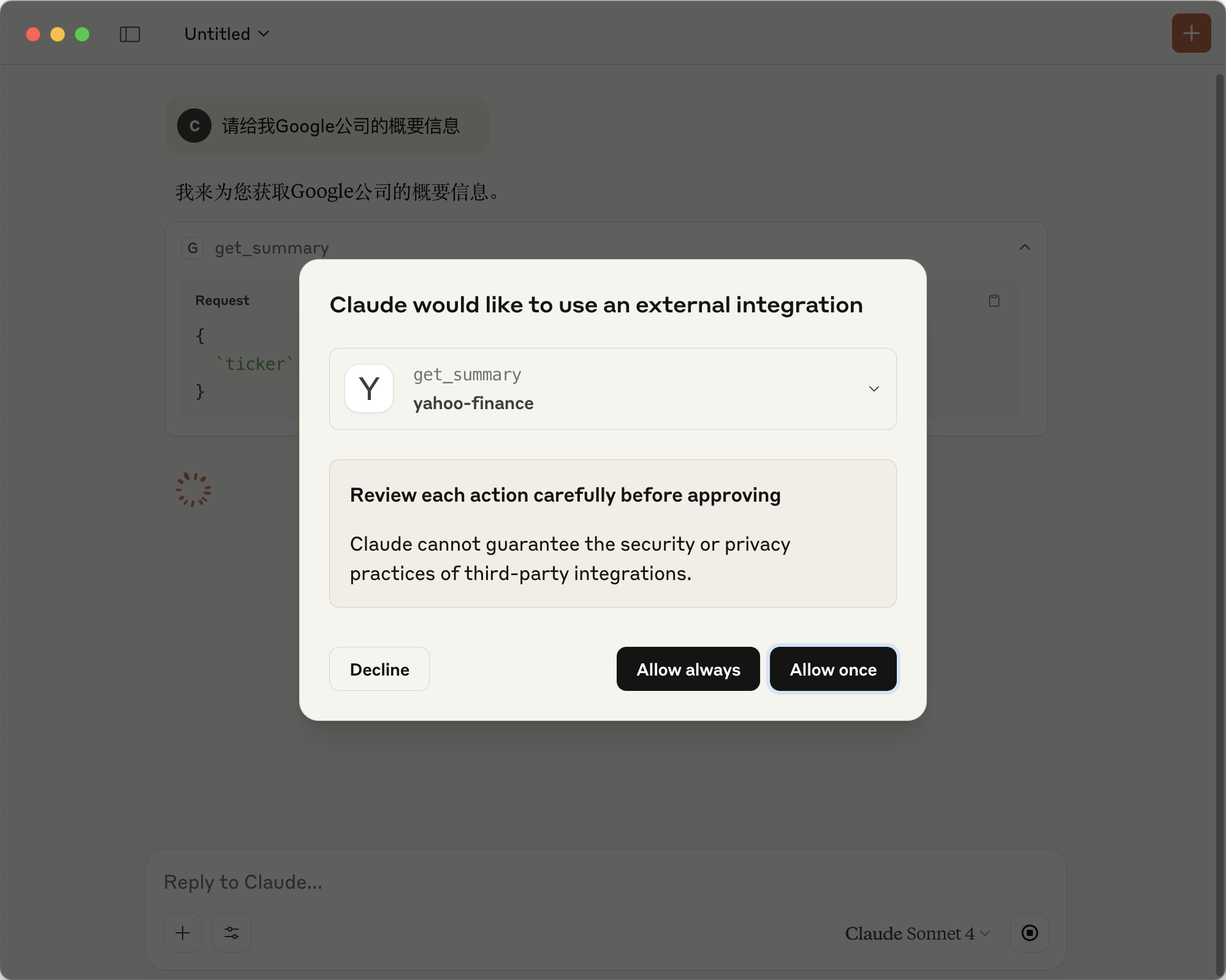 通过这个服务器,Claude 桌面应用将能够回答与公司财务信息和新闻相关的查询。