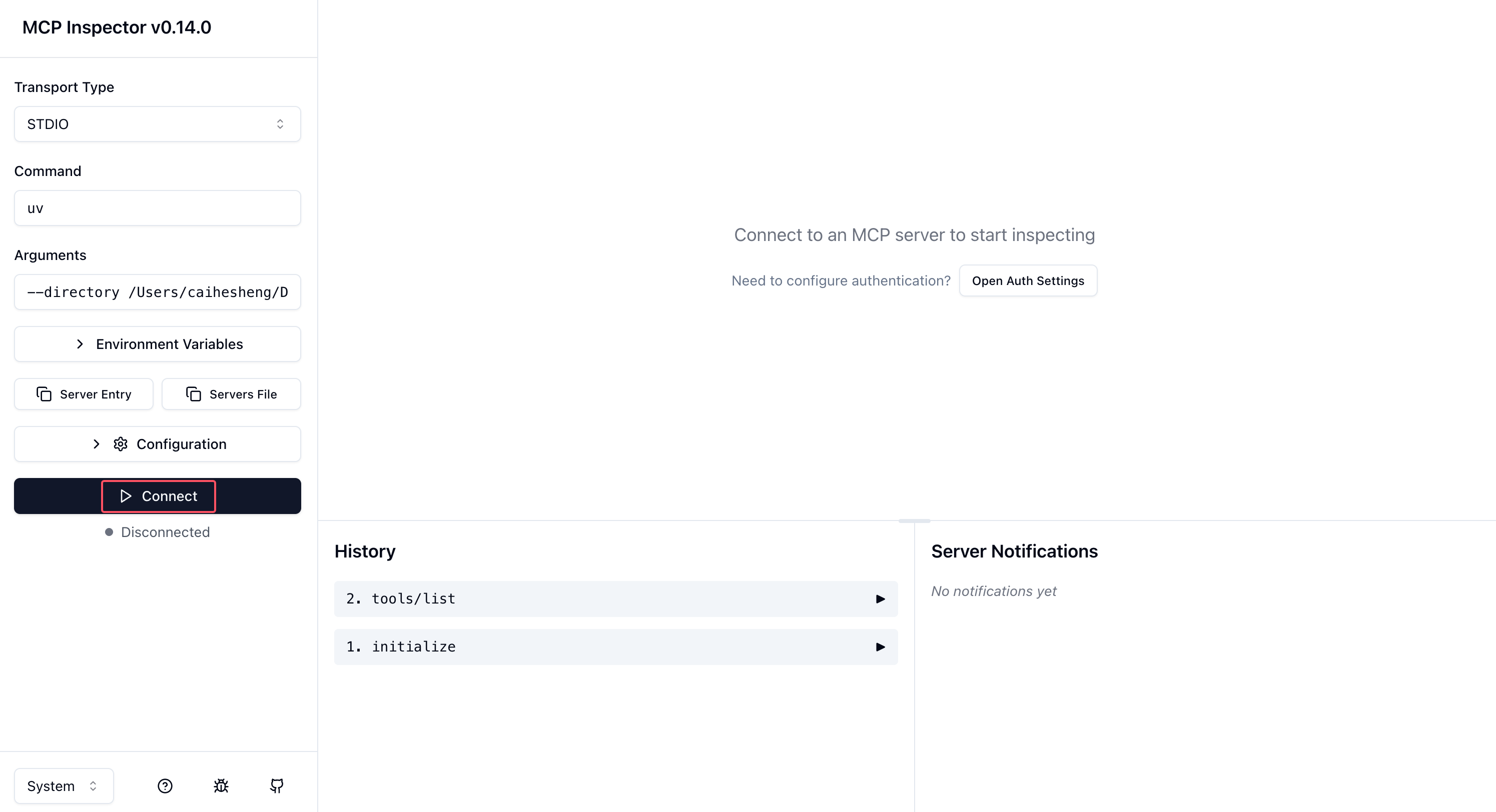 MCP Inspector 是一个开发工具,允许我们通过交互式调用工具测试和检查 MCP 服务器。