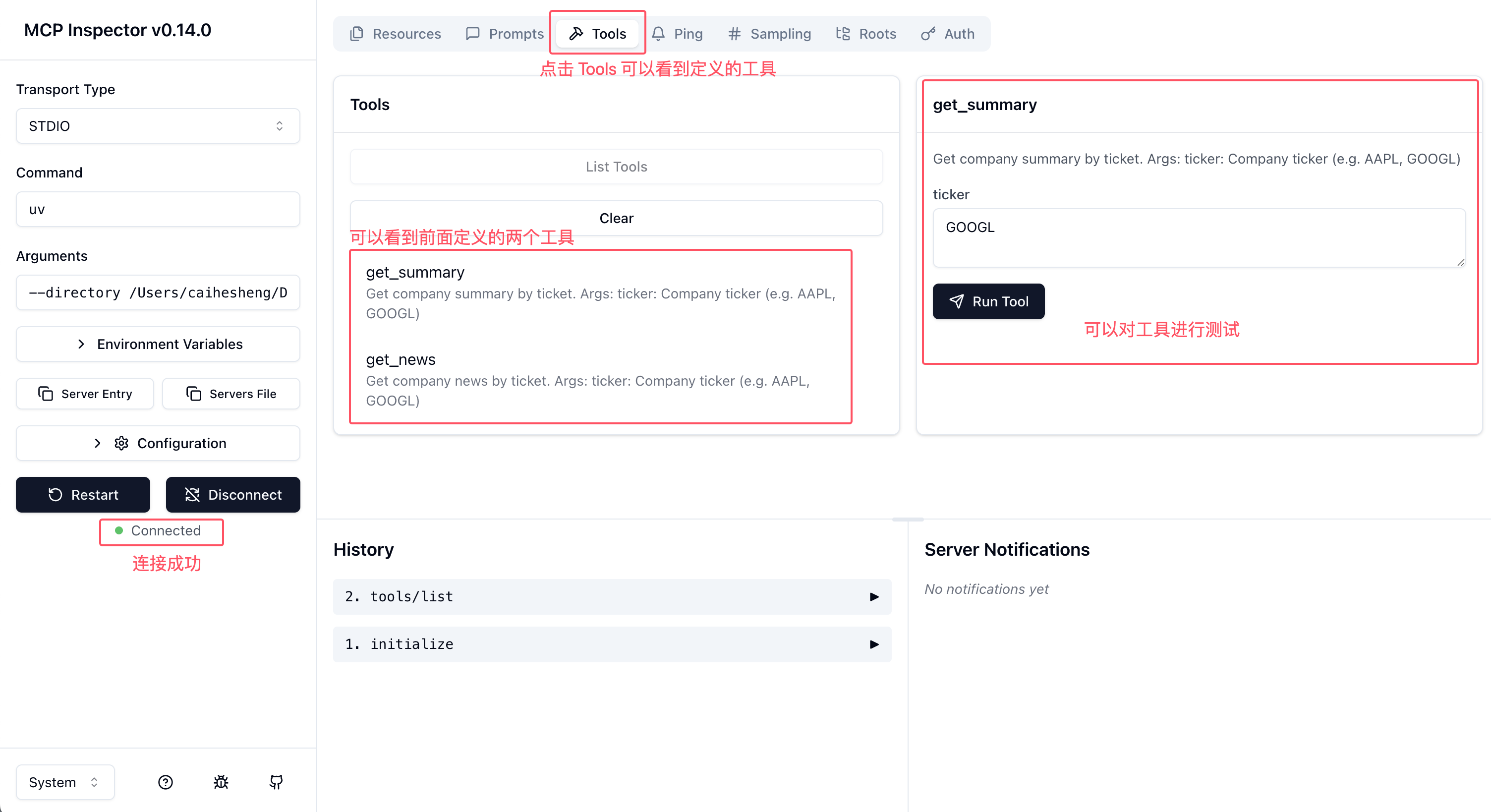 可以看到成功运行了 MCP 服务器 yahoo-finance.py,并且获取了工具列表get_summary、get_news: