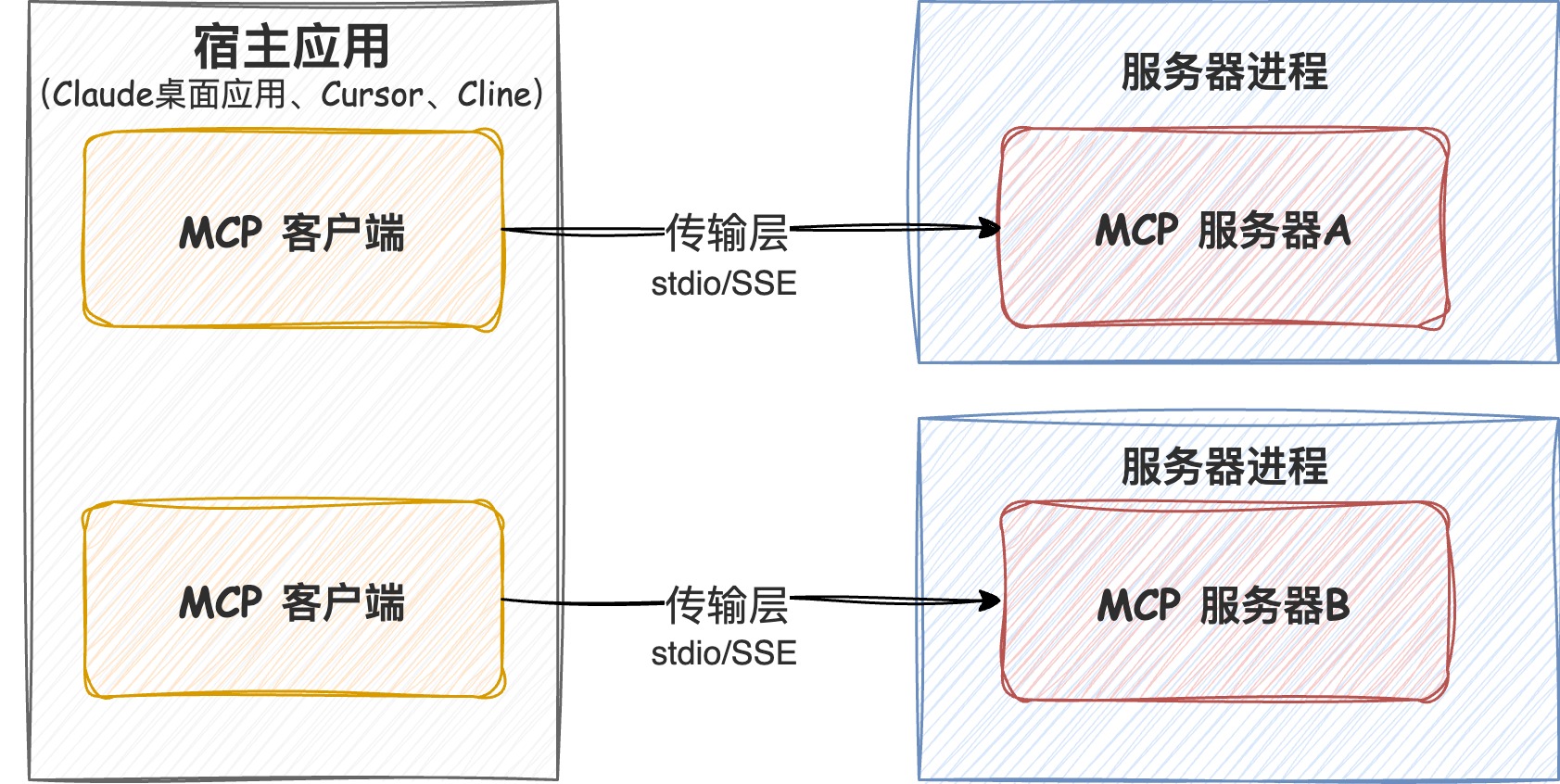 - MCP 宿主:使用 MCP 连接各种资源的应用程序,例如:AI 助手、开发环境和专门的 AI 工具,一个宿主通常包含多个MCP客户端。