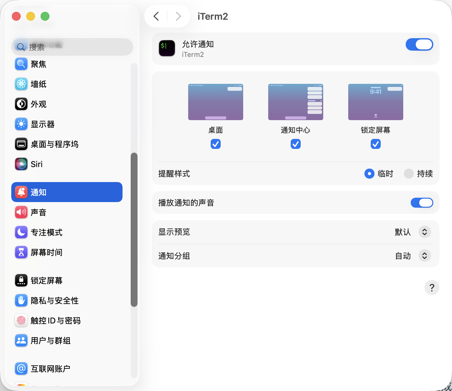 前往「系统设置 → 通知 → iTerm2」,打开「允许通知」,并开启「播放通知的声音」。
