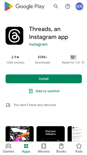 我们直接下载一个来一探究竟。在Google Play/App Store上搜索Threads并进行安装,目前Threads支持100多个国家和地区,因此需要用这些地区的账号下载,可以看到它的logo像一个@字符,并写着是一个Instagram App。