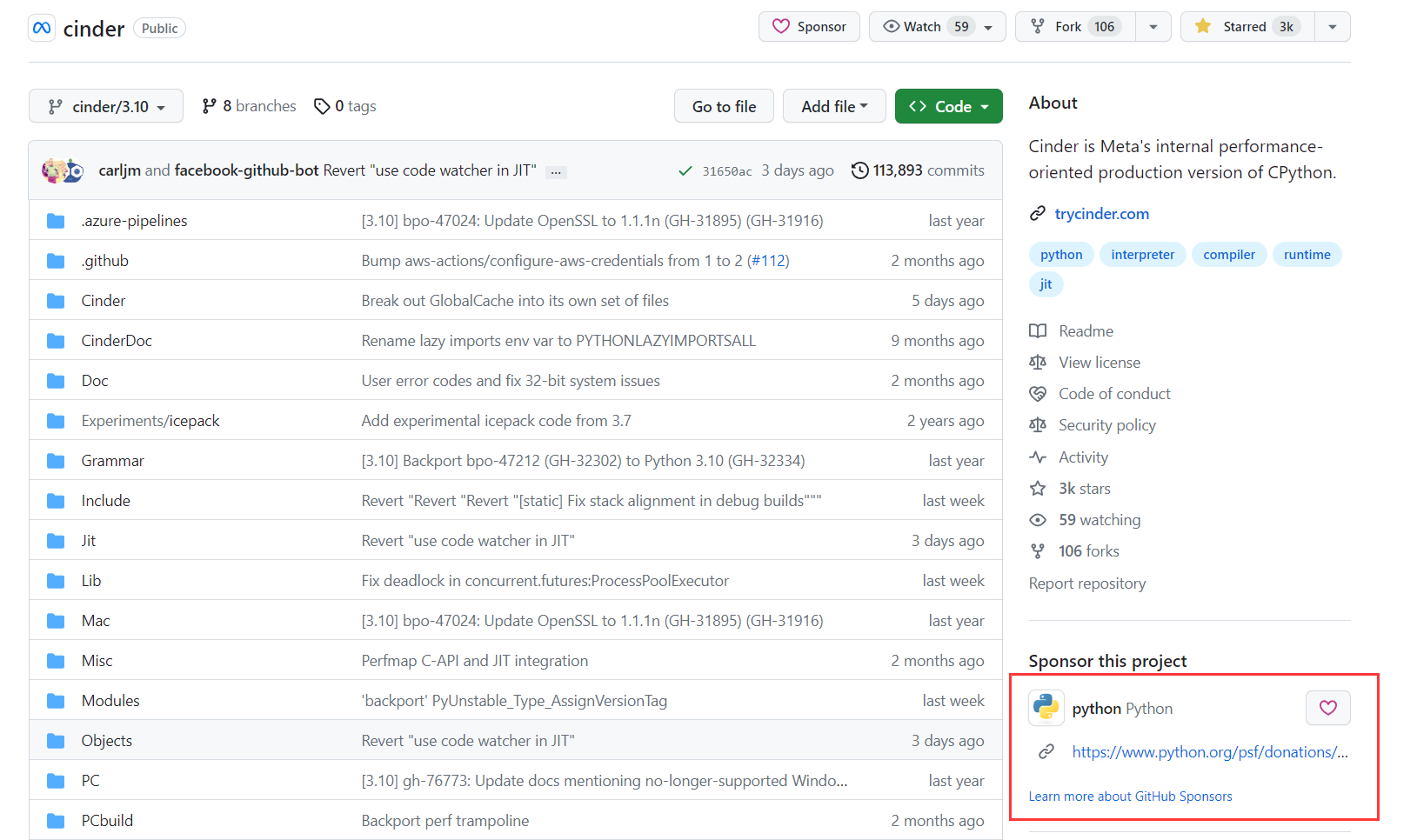 此时有小伙伴会说,Cinder不是Python。确实,Cinder在Python的基础上引入了大量的优化,针对性能进行了许多优化,包括JIT(即时编译器,JIT compiler,just-in-time compiler)、字节码内联缓存、延迟加载模块、预编译静态模块、协程的即时评估,以及实验性字节码编译器。但是,它的本质依然是Python。