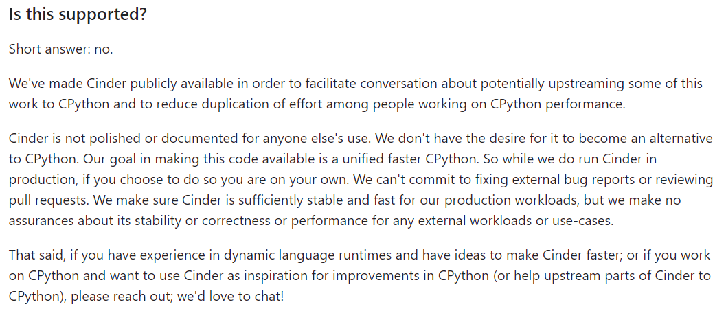 Cinder也明确表示不会成为CPython的替代品,并且也不会提供支持。