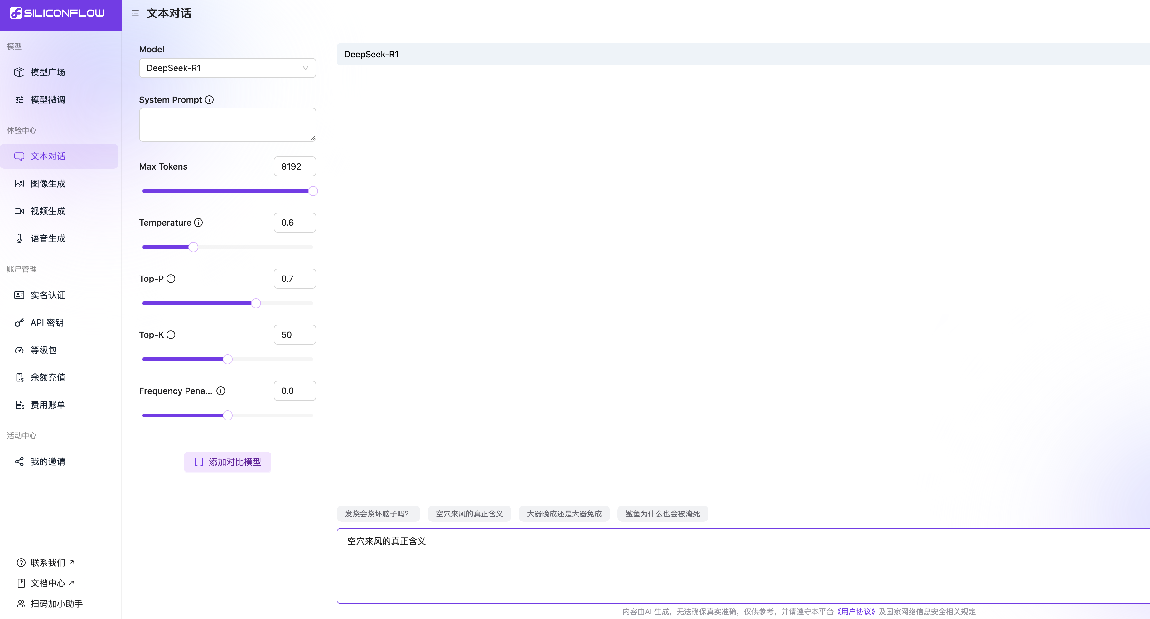 第二种方法就是SiliconFlow(硅基流动)网站,它也是满血的DeepSeek R1,可以调用API,也可以直接对话。