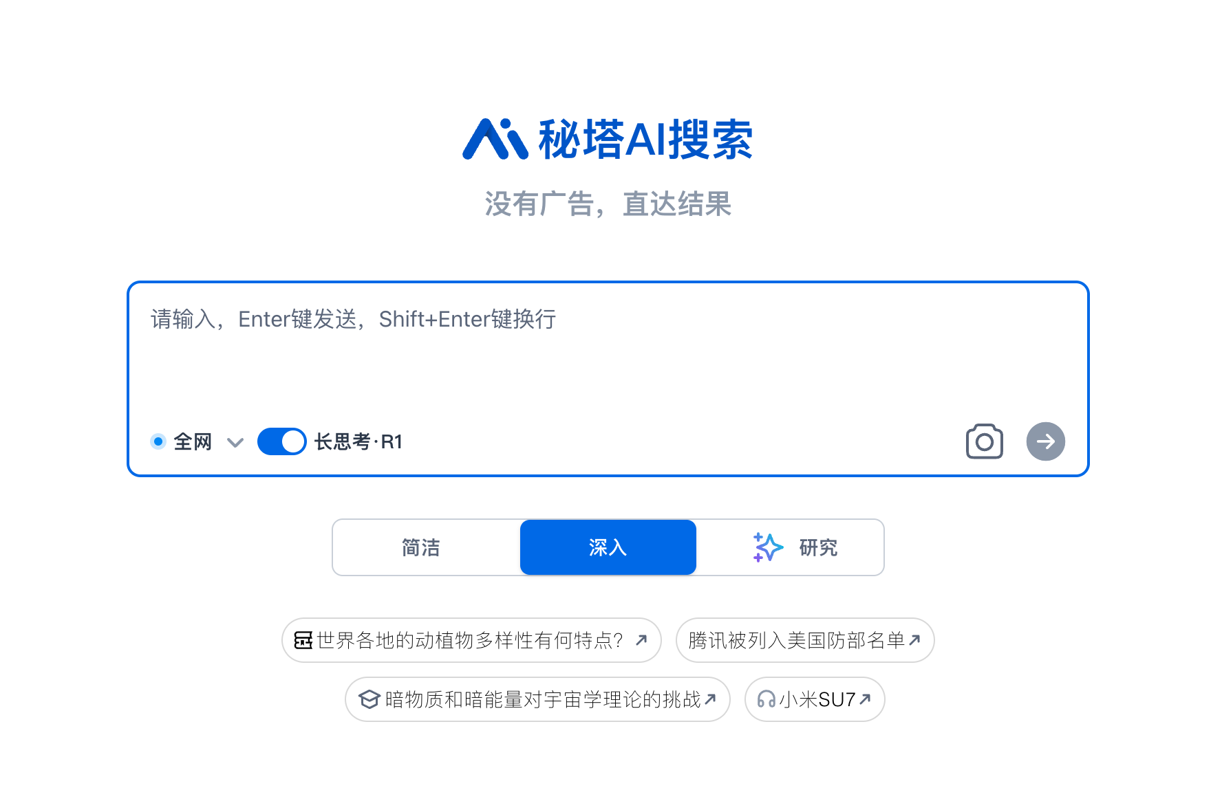 第三种,秘塔搜索也刚刚上了满血版的R1,开启长思考选项,调用的就是R1了。好处就是目前是免费的,并且它本身就自带了搜索功能。所以说对于要调查内容什么的很方便。但是坏处就是它做不到多轮对话,联网搜索也关不掉。看样子还是一个比较纯粹的AI搜索工具。