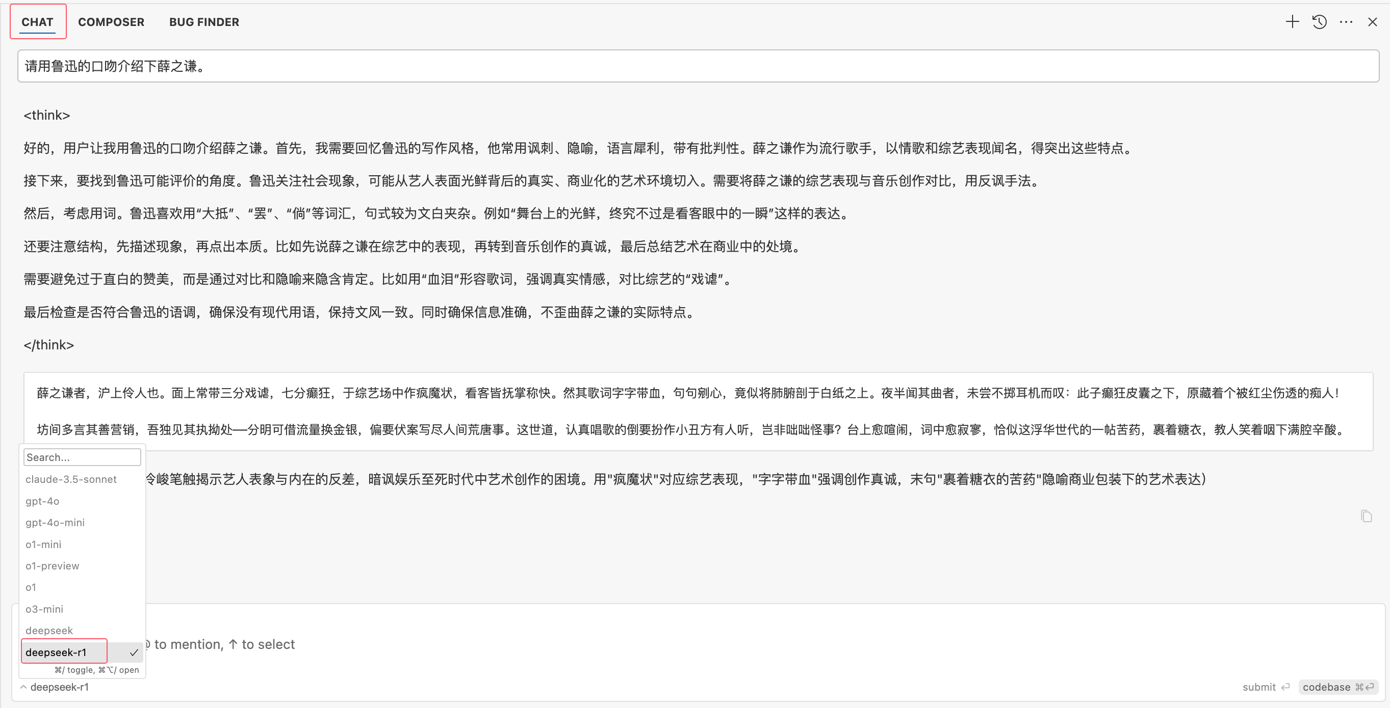 第四种Cursor里面的R1也是满血版的,点击CHAT就可以当成R1来用,坏处就是只有Cursor的会员才能用,免费额度很快就会用完了。